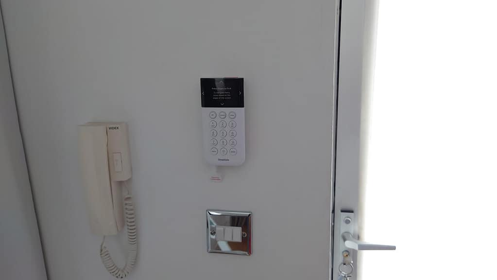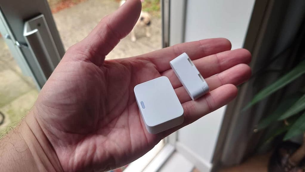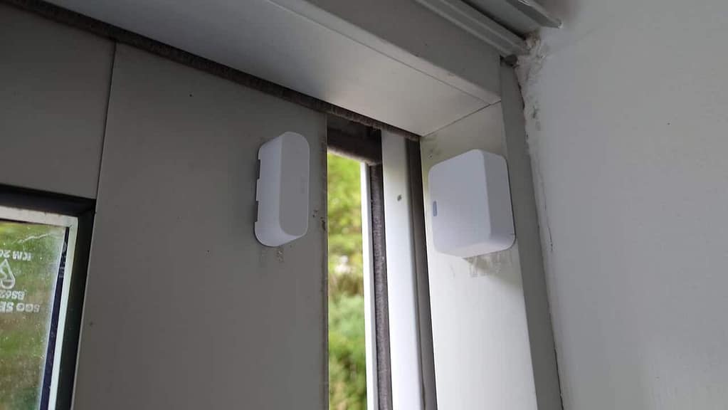 Мы решили установить одну из них на входной двери, а другую — на двери во внутренний дворик. Установка была приятной и простой, с маркировкой на двух частях устройства, указывающей, в каком направлении их следует размещать, и синим светодиодом для проверки функциональности (два мигания при открытой двери, одно при закрытой).