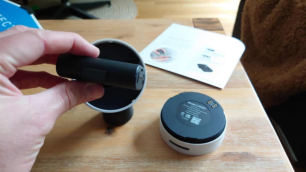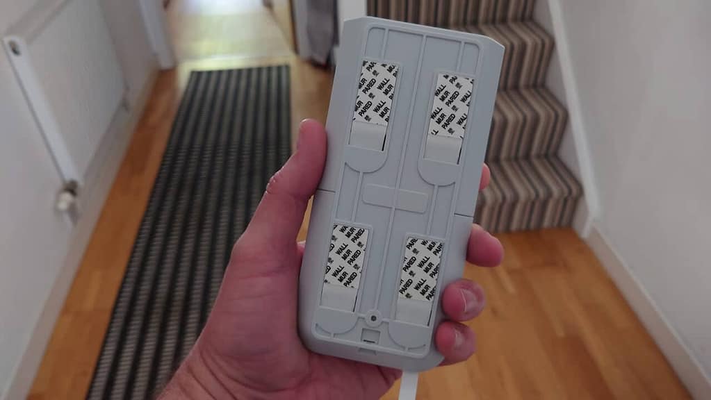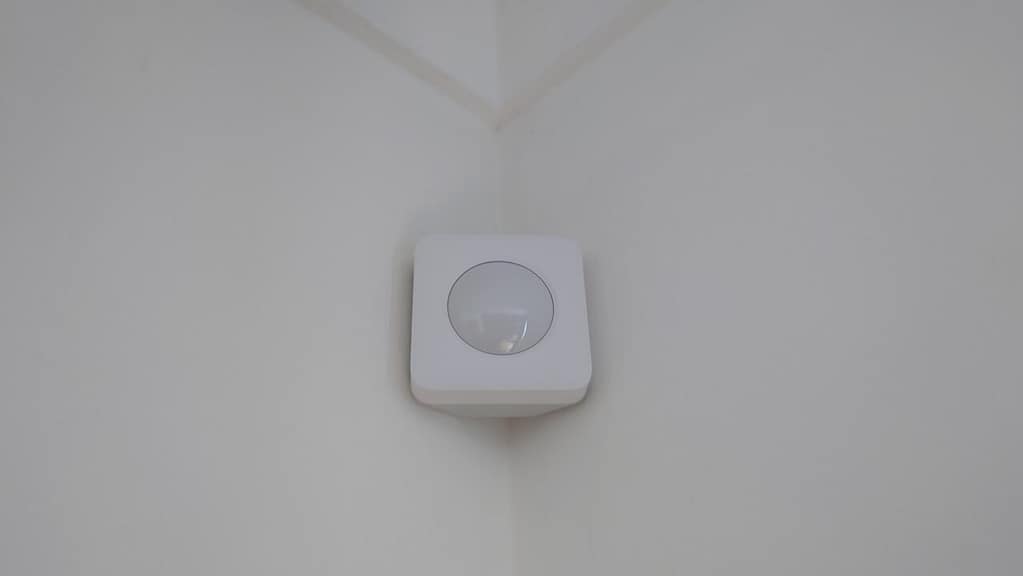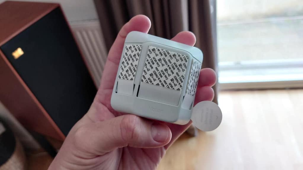 Как и клавиатура, датчик движения имеет клейкие полоски на обратной стороне, поэтому его легко установить в углу гостиной. Для владельцев домашних животных есть возможность установить ее ‘вверх ногами’, чтобы крупные собаки или кошки не потревожили ее.