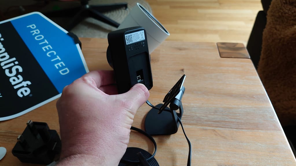 Чтобы подсоединить кабель питания к камере, вам нужно снять его с подставки, продеть кабель в отверстие, подсоединить, а затем вставить камеру обратно. Мы разместили ее так, чтобы она могла видеть активность в гостиной.
