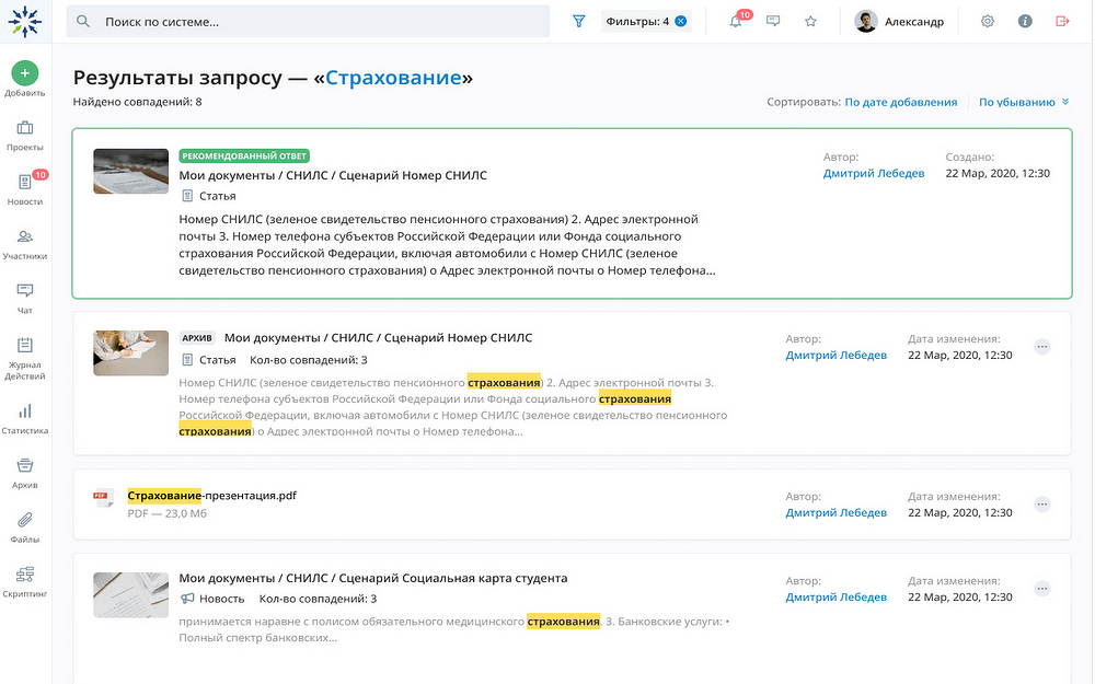 Поиск – вариативный, при этом учитывается раскладка, исправляются ошибки, а также анализируется поведение пользователя для более быстрой выдачи ответа. Хорошо налажена отчетность, есть и экспорт, и импорт в формате как PDF, так и Word. После внедрения будет помощь в адаптации и структурировании контента.