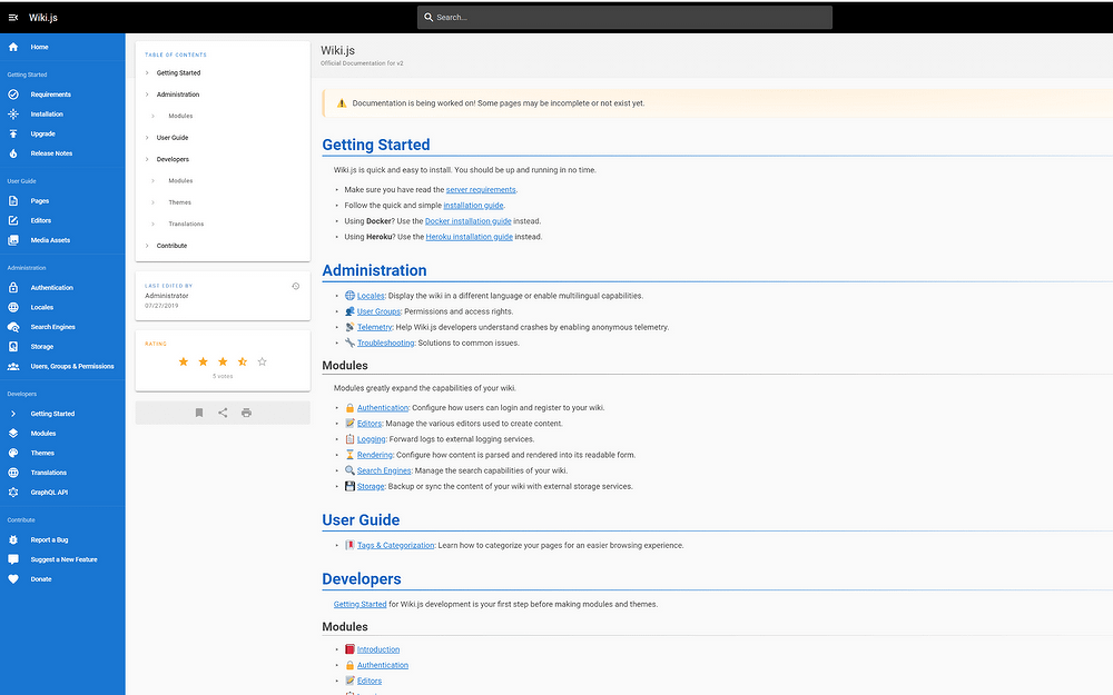 Wiki.js пользуется популярностью по всему миру. Приложение работает на движке легковесном Node.js и оптимизировано для слабых процессоров.