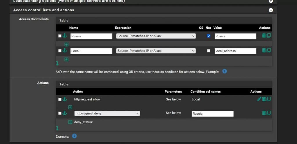 Теперь осталось только выбрать действие для триггеров. Тут надо понимать, что действия срабатывают сверху вниз, до первого совпадения, поэтому сначала указываем разрешительные правила, а ниже по списку – запретительные. Установив флажок “Not” мы можем включить инверсное правило. В самом простом случае нам потребуется разрешить доступ из локальной сети и разрешить доступ из России. Первое разрешение мы указываем явно, а второе – инверсно, то есть запрещаем все любые адреса, кроме тех что из России и США. Само действие задается ответом сервера на запрос, с разрешительным все понятно – сервер должен принимать заголовок. А вот запретительных может быть несколько, в том числе редирект. Я не вижу смысла мудрствовать лукаво в выборе отбивки и считаю что выбирать http-request allow нужно для разрешительного действия и http-request deny для запрета доступа. Пользователи из разрешённых регионов даже не заметят, что была какая-то фильтрация, а из запрещённых получат 502-ю ошибку и пойдут искать других жертв.