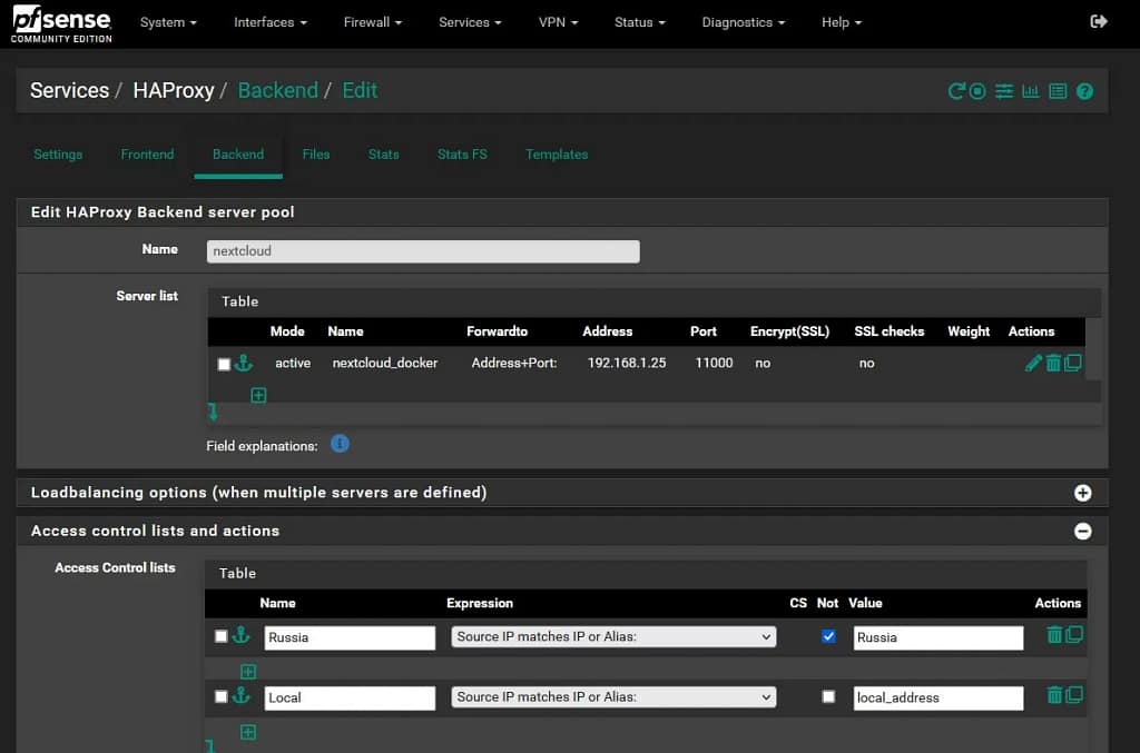 Для настройки ACL (Access Control List) в Haproxy (использовалась версия 2.8-d12 из пакета haproxy-devel 0.63_1) вы открываете ваш Backend и переходите к настройкам ACL. Здесь вы можете выбрать триггер, который будет срабатывать при определенных условиях — например, если источник IP соответствует алиасу Russia или USA.