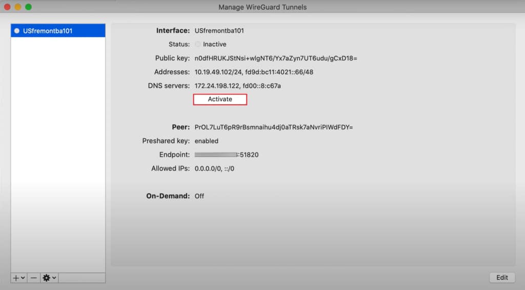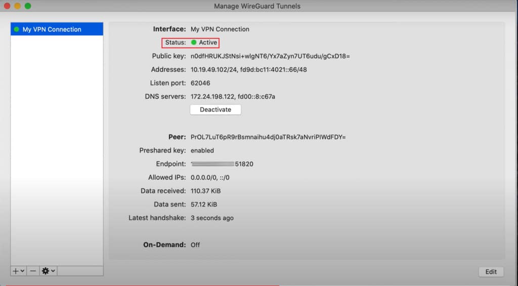 - Как только появится сообщение «Активен«, это означает, что вам удалось установить соединение с сервером WireGuard.