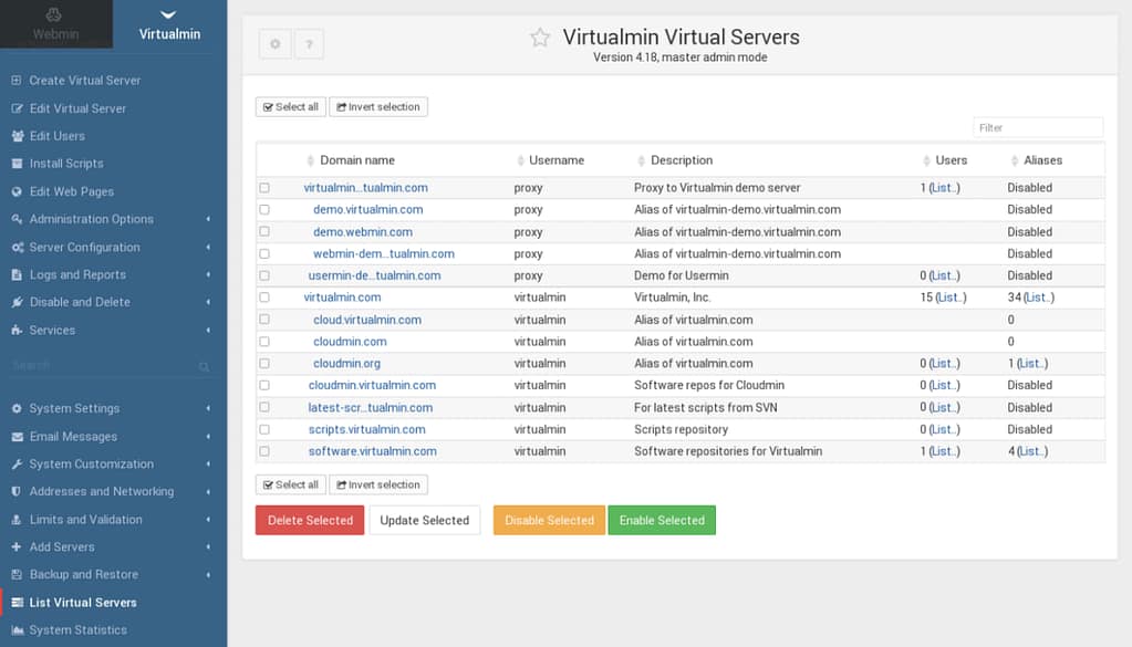 Virtualmin — это мощная и гибкая панель управления веб-хостингом для систем Linux и BSD. Доступна как в версии с открытым исходным кодом, так и версии с более широким набором функций и расширенной поддержкой. Virtualmin является экономичным и комплексным решением для управления виртуальным веб-хостингом. По утверждению разработчиков это наиболее полная панель управления с открытым исходным кодом, которую установили более 150 000 по всему миру.