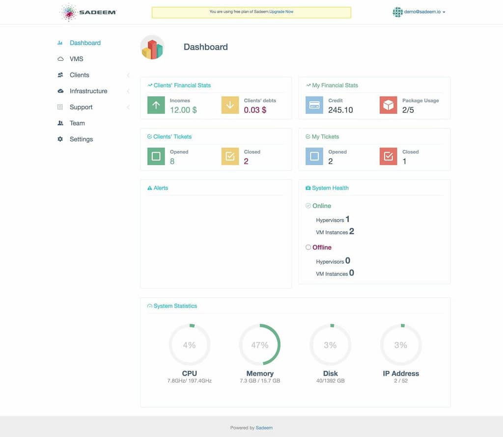 Sadeem имеет простой и элегантный дизайн, и достаточно сильно похожа на Virtkick. Основное отличие ее в том, что она предназначена для облачных провайдеров. Однако Sadeem также включает встроенную систему поддержки и биллинговую платформу.
