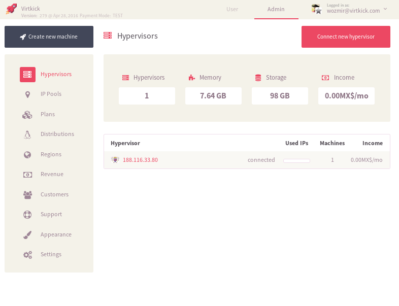 Virtkick — это коммерческое решение «все в одном», сочетающее в себе биллинговую систему и инструменты управления виртуальными машинами. Графический интерфейс минималистичный и простой в использовании даже для клиентов VPS. Разработчики Virtkick позиционируют его как идеальное решение для небольших дата-центров или игровых серверов.