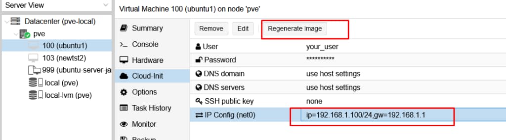 Теперь важно указать корректные значения для новой ВМ. Для этого надо скорректировать в разделе cloud-init IP-адрес, маску и шлюз + остальные параметры при необходимости и перегенировать образ уже клонированной ВМ, после чего выполнить запуск: