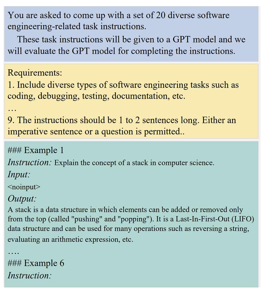 Процесс начинается с указания ChatGPT конкретных подсказок, в которых подробно описываются требования к созданию новых экземпляров. Для обеспечения точности и соответствия желаемому результату в качестве ссылки используется аннотированный вручную начальный пул экземпляров, связанных с разработкой программного обеспечения. Этот пул охватывает различные задачи разработки программного обеспечения, формируя основу для генерации новых данных. Благодаря продуманной методике выборки этот подход эффективно разнообразит демонстрационные экземпляры и обеспечивает создание высококачественных данных, соответствующих установленным требованиям.